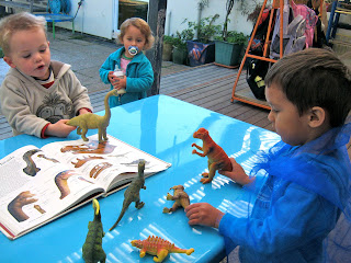 Brayden still has a real interest in dinosaurs. He came up to me one morning asking if I could read him the dinoaurs book. He looked through it and talked about the different dinosaurs we could see. To extend on these, we found the dinosaurs and set them up on the table outside. Brayden was excited straight away and wanted to jump them around and imitate how he sees dinosaurs act. Before long, Seth and Joshua came over, also showing an interest. The 3 boys began moving the dinosaurs along the table, interacting with each other, and making noises for each one. We looked at the book and tried to match the dinosaur to the picture in the book, but they all looked so different.